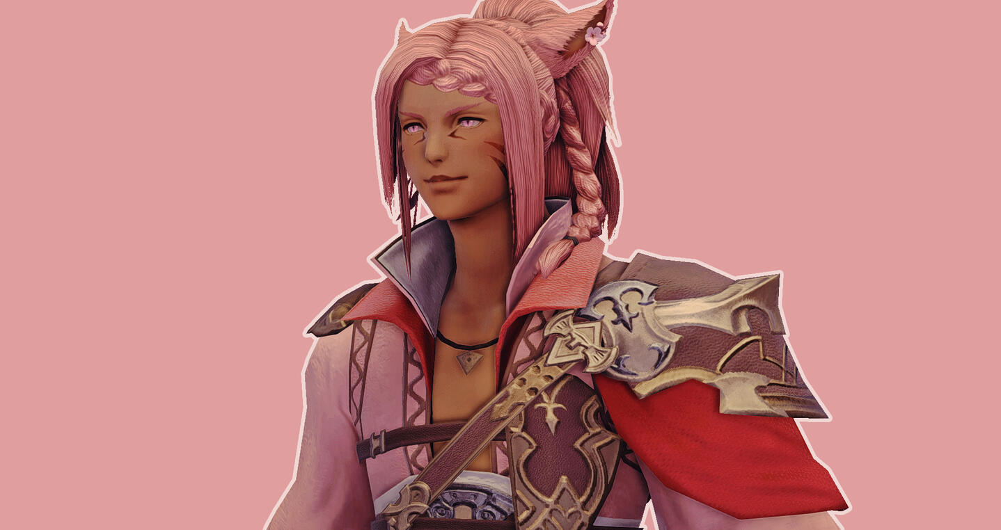 standing at 5'2", rio is short and of small build. he has light, warm brown skin (which is very smooth, thanks to a skincare routine that he strictly adheres to) and long, pastel-pink hair that he usually wears up in a ponytail. similar to his hair, his eyes are light pink in color - and his tail is, too. as a seeker of the sun, he was born with face markings that are typical to his race.