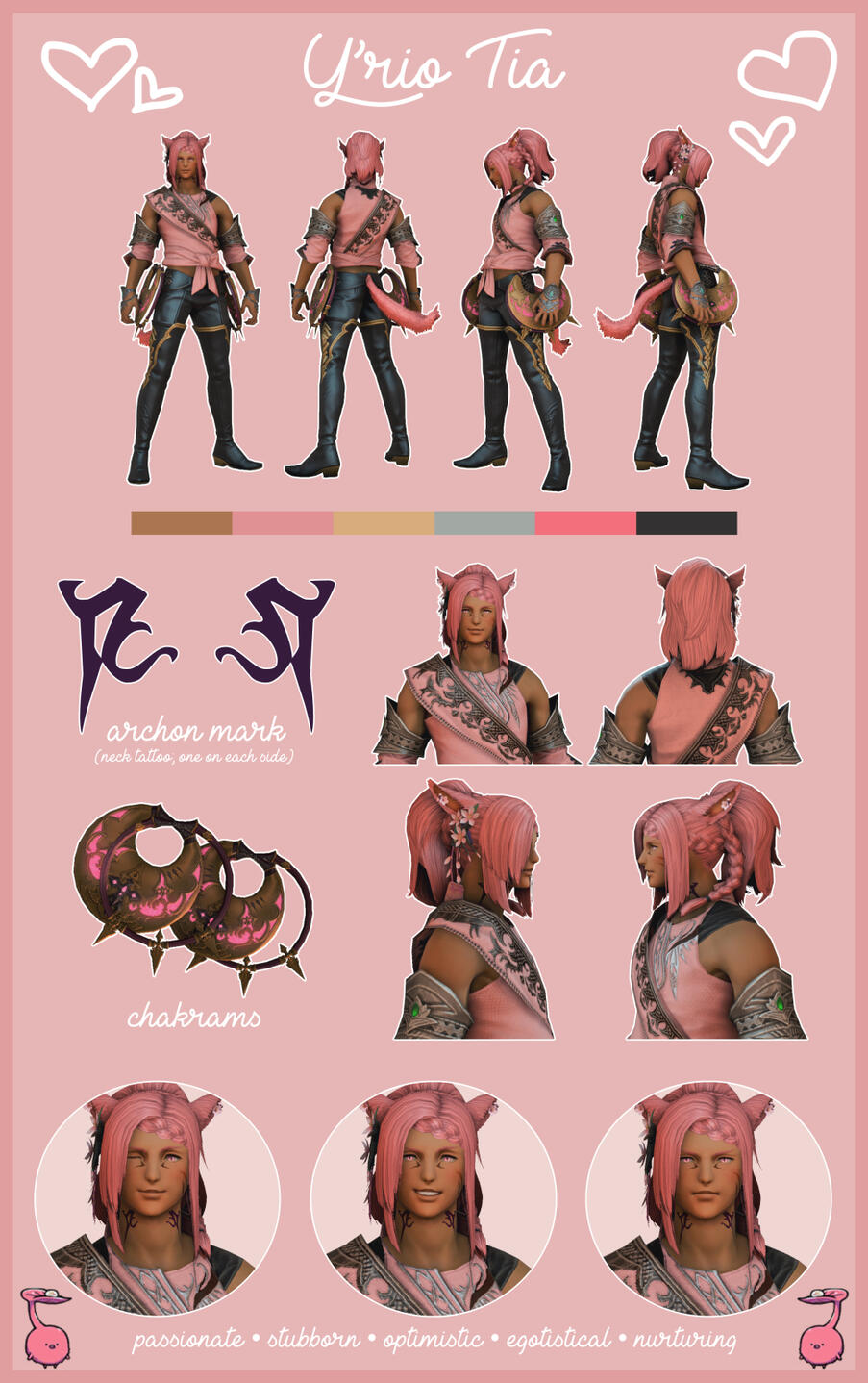 prior to the exodus, rio loved spending time in saint mocianne's arboretum. he has vague memories of it during its prime, but his fondness for korpokkur likely has roots in his childhood days spent wandering around in there. nowadays, he collects different types of korpokkur and keeps them as pets. two are big enough for him to ride as mounts.he typically ignores his tribal name (y'rio) entirely and prefers being referred to as 'rio.' there's no deep reason to this; he just likes how 'rio' sounds. this tends to offend more traditional seekers of the sun, but rio doesn't particularly care. if someone he is friends with uses his tribal name, he'll be quick to ask them to swap to his given name. similarly, rio's stage name is simply 'rio.'rio was an absolutely terrible cook before he arrived in eorzea, largely due to the bland, nutrients-focused nature of sharlayan cuisine. his taste in cuisine has since become far more refined, and his cooking abilities have improved, too. rio loves desserts in particular and has a major sweet tooth. rolanberry cheesecake is a favourite meal of his, but, desserts aside, he is also very fond of the battered fish served at the bismark in limsa lominsa.his favorite seasonal event is the moonfire faire. if he has to do virtually any work while it's ongoing, he gets very short-tempered. like, moreso than usual.